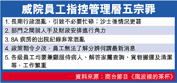 發給商台節目《風波裡的茶杯》的傳真又指,威院的混亂情況在沙士疫潮後更甚,部門間常就人手及財政明爭暗鬥,院方政策朝令夕改,令員工無所適從。