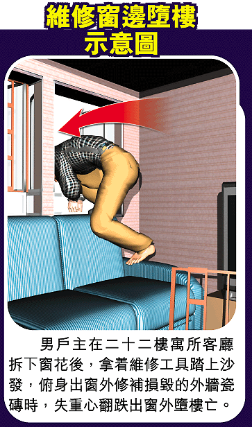 【本報訊】一名退休公務員昨午在鰂魚涌二十二樓寓所客廳,以沙發作踏腳,俯身出窗外修補窗邊損毀的瓷磚,以防天雨滲水入屋時,失重心翻跌窗外飛墮一樓平台,當場頭爆肢折送院搶救不治。死者的妻子在醫院驚聞噩耗,悲傷痛哭,並自責沒有阻止丈夫維修窗邊瓷磚。