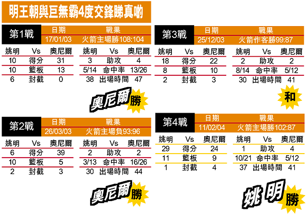 在這場「西岸明星賽」中,「明王朝」與「巨無霸」對決再次成為全場焦點。今次已是兩人的第四次碰頭,在前三次奧尼爾的表現均較姚明搶鏡(見附表);但今次「明王朝」技驚四座,全場轟入了二十九分和十一個籃板,更兩次在奧尼爾手上取得「And1」,教全場球迷大呼過癮。至於因防守姚明以致六犯離場的奧尼爾,是役取得了二十四分及九個籃板,同時剛傷愈復出的拜恩只有十四分,僅成火箭強勢升空下的配角。