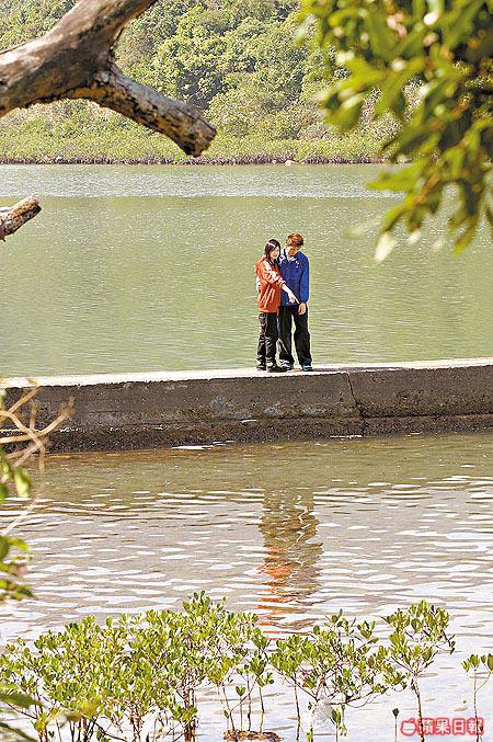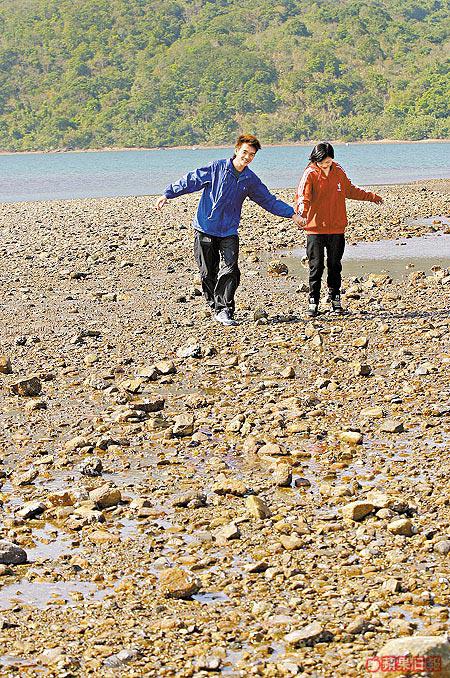首站是全港最短的大灘樹木研習徑,全長只有200多米,研習徑雖短,但也有20多種不同樹木,全部認清,要花一天半日,Chrissie隨手撿起一片枯葉,着Rock嗅一嗅:「呢塊係白千層樹葉,有白花油成份,聞一聞醒腦提神!」Rock也隨手拾起一片心形枯葉,示愛:「我唔知係乜樹乜葉,但送葉如送心。」