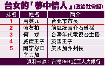 調查顯示,在政治與社會組別中,今年五十四歲的小馬哥再度以超人氣姿態,高居女性「夢中情人」榜首,而其貌不揚的總統陳水扁竟也上榜排第八。在演藝明星組,台灣女人的首號情人是美國影星「帥哥」湯告魯斯。