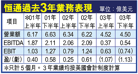 因經營環境進一步惡化,恒通去年初曾重整銀團貸款及業務發展策略,惟Telstra昨日公布的業績顯示,恒通經營情況並無改善,截至03年12月底止6個月,營業額4.5億美元,虧損1.13億美元(見表)。Telstra並表示,持續的減價戰下,恒通發展前景並無改善,根據銀團貸款條款,公司有需要再為恒通投入不多於6500萬美元,以助後者符合其財務承擔。