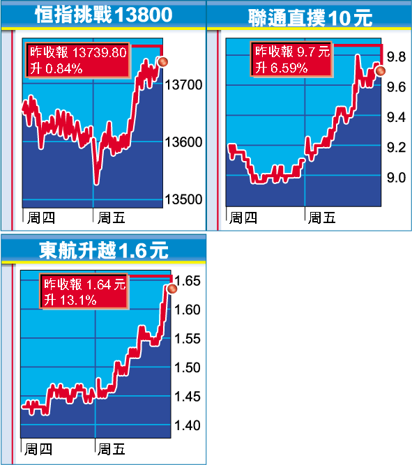【本報訊】港股昨日低開後,公司抽水的消息此起彼落,拖累恒指一度滑落至13526,跌98點,但低位見反彈,恒指在中資電訊股、新鴻基地產(016)及中銀香港(2388)帶動下,以接近全日高位收市,報13739,升114點,與上月27日的13780的3年新高相距僅40點,港股昨日成交略縮減至199.97億元。即月期指收13750,高水11點。