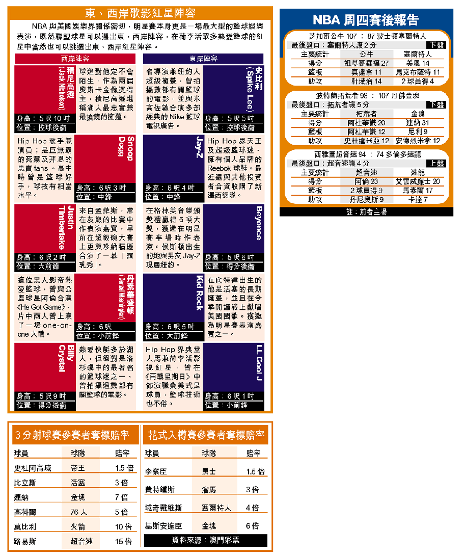 NBA明星賽曾於八三年在洛杉磯舉行,當年主要是一項為期兩天,讓聯盟兩岸明星一展身手的表演賽,並非像如今四處人山人海、派對開個不停及紅星名人雲集的「黑人超級碗」式明星賽周末。「明星賽的演變簡直不可思議。」魔術手莊遜說。「當年的明星賽只是為期兩天的體育盛會,但如今演變成延續六、七天的狂歡派對,體育及娛樂共冶一爐。」今年明星賽票王「加拿大飛人」卡達憶述:「在去年的亞特蘭大明星賽上,簡直萬人空巷,道路水洩不通,令我感到有點受寵若驚。」