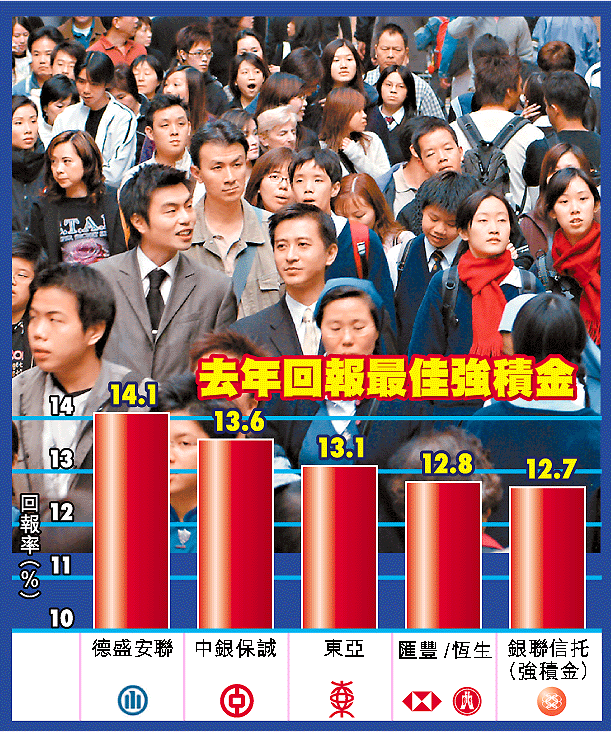 若以去年10至12月的第4季度回報計算,中銀保誠表現最佳,平均回報率5.2%;東亞以5.1%排名第二;安盛(AXA)及道亨同列第三,回報率達5%;滙豐/恒生與信安B300系列同列第五,回報率為4.9%。