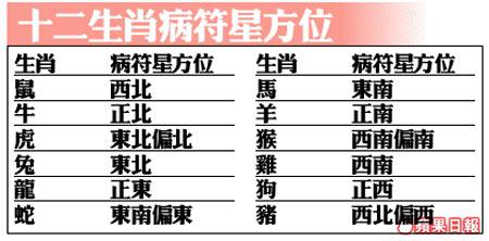 每個生肖都有一粒「病符星」,此星掌管疾病健康。要加強自己的健康運,得找出自己生肖所屬的病符方位,再利用風水吉祥物,化解此病星的凶力;除此之外,流年西南方亦有「病符星」飛臨,不可不防。