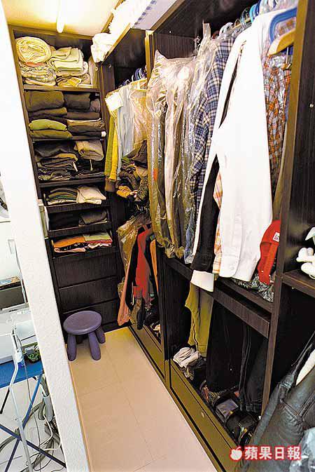 至於半掩式衣帽間,位於房門後方,乃向鄰房偷位而來,以間板與寢區分隔開,窄長的衣櫃,沒有門,容量更加豐富,小小的心思,效果佳而且實用性高。