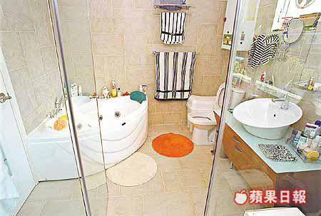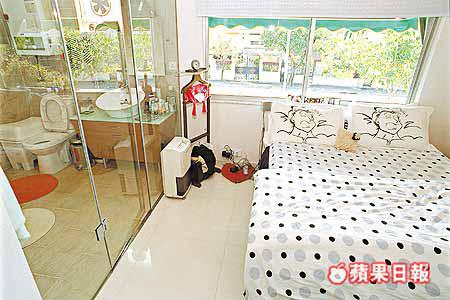 主人房及浴室間隔經過改動,浴室原本外連貯物室,合併後就有足夠地方,容納巨型水力按摩浴缸,保留向走廊的門位,而向主人房的牆身,則改用玻璃間隔,加裝玻璃門,形成套房格局。