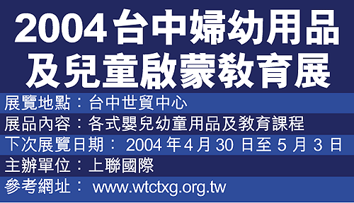 這個「台中婦幼用品及兒童啟蒙教育展」平均每季舉行一次,展品包羅萬有,但凡跟兒童有關的事物幾乎皆可找到;從臍帶血銀行、英語教學課程,至各式嬰兒幼童用品,每筆開銷都是數萬元(新台幣)計,看來現代父母育兒前得先學習精打細算。
