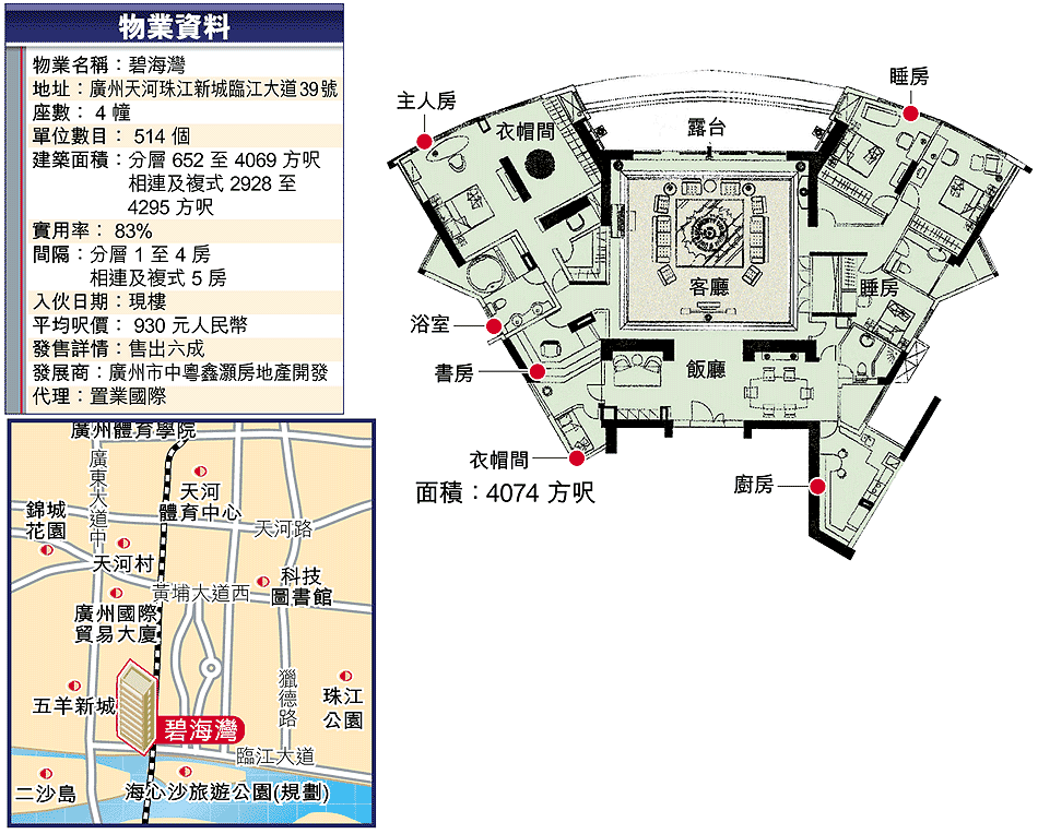 佔地十五萬方呎的碧海灣,南北朝向,南臨數十米闊的沿江公園,從沿江公園回望過去,四幢碧海灣向珠江張開,視野隨之蕩過公園、長堤,跨過二沙島、海心沙,再飄過遼闊江面,奔往對岸的海珠區。
