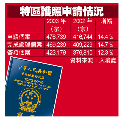 首席入境事務主任(證件)周康道昨接受訪問時指出,自去年沙士疫情冷卻後,入境處接獲申請特區護照的個案便持續增加(見表),尤其是本月份,平均每日接獲二千七百宗申請,其中本月二十三日更接獲三千四百宗申請,打破九八年至今的單日最高紀錄。