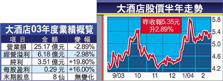 【本報訊】大酒店(045)03年上半年度受「沙士」影響,令營業額大跌,即使下半年度業務迅速回升,但全年的營業額仍下跌約3%。不過,下半年因「沙士」令業務中斷而獲保險賠償9500萬元、資產重估回撥6400萬元,及北京王府飯店業績首次併入帳目,令該集團去年度純利3.51億元,上升20%,每股盈利0.29元,末期股息8仙。