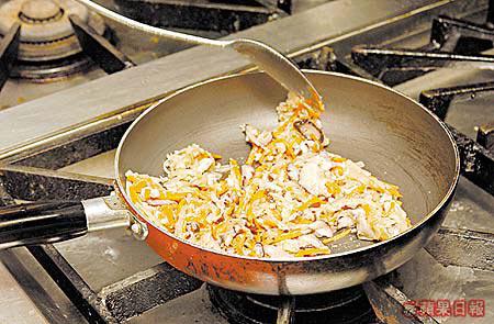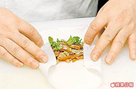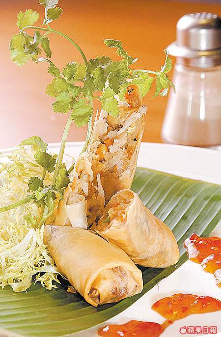 3.將剛炒好的材料加入芫荽拌勻,放適量餡料至春卷皮內,將兩邊往內摺。將春卷捲好後,以麵粉漿封口。油溫不要太滾熱,將春卷炸至金黃色,對切上碟,吃時伴以泰式雞醬。