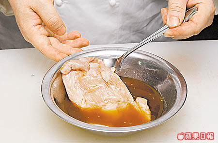 1.將日式照燒汁、味醂、清酒、麻油和有機蜜糖同醃豬頸肉2小時。放入焗爐以攝氏200度焗熟,放涼,切絲。