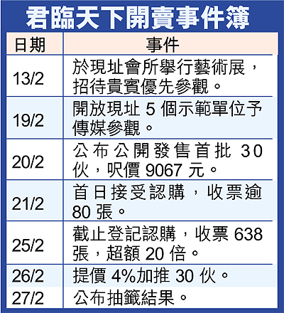 恒隆地產執行董事吳士元表示,君臨天下於登記期內共接獲638張入票,超額20倍。因應市場反應佳,提價逾4%加推30伙,令公開發售單位增至60個,首批30伙呎價9067元,加推單位平均每呎9470元。
