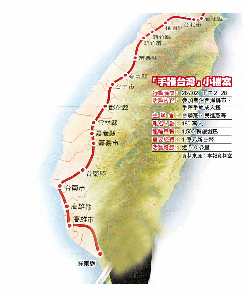 由綠營「手護台灣大聯盟」發起的「百萬人牽手護台灣」行動,將在明日下午二時二十八分正式登場,將創下人數多、運輸車多、經費高、活動路線長等紀錄(見附表)。主辦機構表示,由於反應熱烈,一些市區恐怕不是手牽手而是肩並肩。