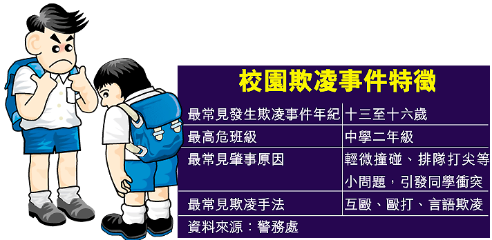 另外,教育統籌局本周會向全港學生及家長,派發講解欺凌問題的小冊子。中學校長會昨召開會議後決定,本月底邀請曾出現校園暴力事件學校的校長出席座談會,分享危機處理經驗,但主席葉錦元表示,有關座談會不會邀請教統局官員出席。