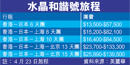 美麗華集團市務及服務監察管理總監周韻琴說,一般豪華郵輪旅程最少需十多天,但因港人假期不多,故與郵輪水晶和諧號達成協議,首次推出六天旅程,團費減至最低一萬三千五百元,較以往團費便宜三、四千元。
