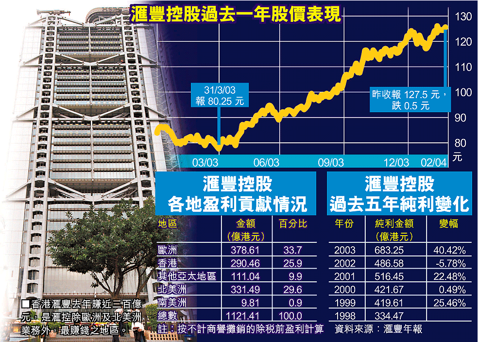 【本報訊】滙豐銀行的母公司滙豐控股集團去年大豐收,盈利創歷來最高紀錄,達六百八十三億元,較○二年急升四成。盈利勁升主要受惠於去年初的大型海外收購活動,令該集團在香港經濟處於低潮時仍可賺大錢。對於股東,末期息約派一元八角七仙,全年派息額增加百分之十三,每股共約四元六角八仙;今年度的首季股息七月派發,肯定再增百分之七。 記者:劉美儀