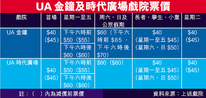 去年九月UA院線曾調低旗下六間戲院的票價,但UA金鐘及UA時代廣場兩院部份時段票價,仍較同區百老匯院線的PalaceIFC及皇室戲院高出五或十元。