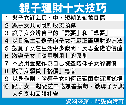 【本報訊】一項調查發現眾多的父母管教之道中,最被忽略的是金錢管理技巧。負責調查的人員憂慮子女理財不善,容易令他們被金錢控制,又或跌入財務危機,甚至走上自毀之途。