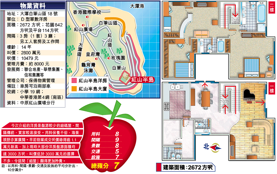 中原許子華表示,紅山半島最新一宗洋房成交,呎價突破1.1萬元,屬面積3050方呎的B型屋,3月初以3400萬元易手,呎價11148元。