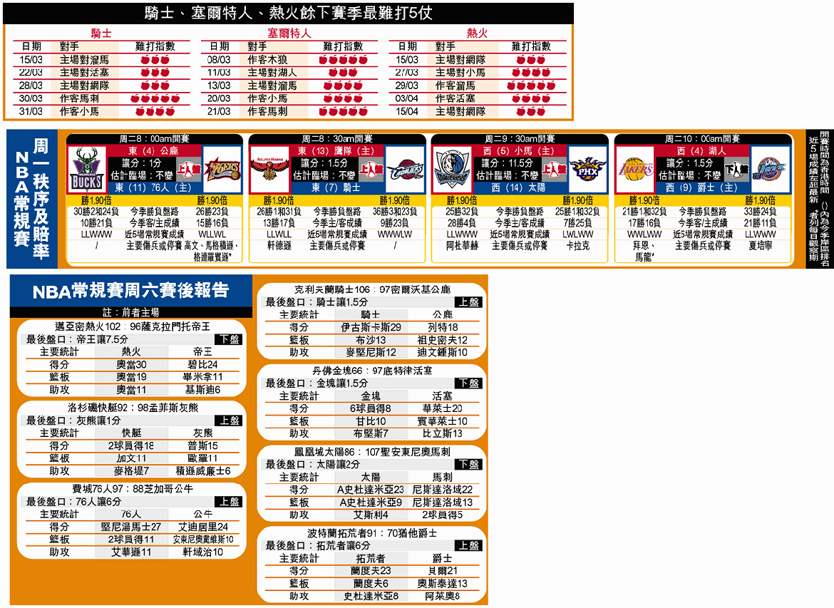 去季包尾大幡的騎士在「占士大帝」貢獻二十四分、十次助攻、七個籃板,以及伊古斯卡斯攻入二十九分下,上周六以一百零六比九十七壓過作客的公鹿,目前與塞爾特人及熱火同以二十七勝三十六負,並列東岸第七位;令東岸季後賽第八席位之爭演變成「三強鼎立」的局面。