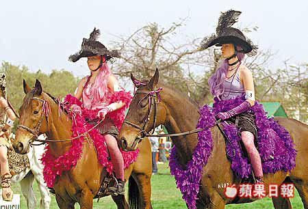 為紀念羅湖騎術會成立十周年,賽會昨午在上水河上鄉舉行春季騎術大賽賽事;以及馬與車接力賽、傷健人士騎術表演及馬匹化妝選美大賽,而整日高潮「飛越紅牆馬匹跳高賽」,李爾與其座騎YouBet成功越過一米七○的高度(圖一),除打破保持了十年的一米六○舊紀錄外,還為她帶來一萬元獎金。圖二為兩女騎師與其經過悉心「扮靚」的馬匹出席化妝賽。司徒世華攝