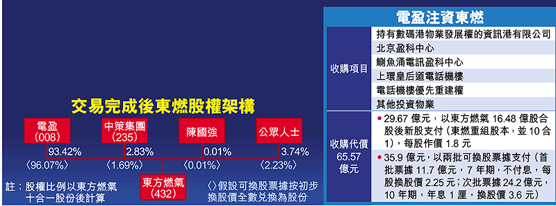 【本報訊】電訊盈科(008)昨宣布,以總代價65.57億元將核心物業資產售予東方燃氣(432),東燃發行新股及可換股票據支付有關代價,交易完成後,電盈成為東燃最大股東。除了電盈注入的資產,電盈控股公司盈科拓展及大股東李澤楷持有的物業,不排除將於適當時候注入東燃,令東燃日後成為李澤楷的物業投資旗艦。證券業人士指出,電盈股價自去年底開始重拾升軌,主要是憧憬貝沙灣等物業收益有理想增長,現時集團將物業分拆上市,無形中令股價失去動力,加上上周公布業績虧損61億的影響未反映,預期電盈今日復牌將受壓回落。電盈上周停牌前收報6元。