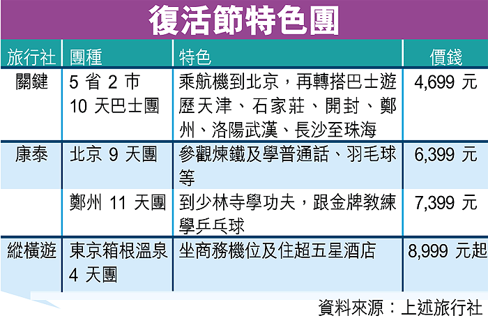 【本報訊】臨近復活節,各旅行社搶客戰進入白熱化階段,挖空心思推出特色團種迎合港人口味。有旅行社以乘坐商務機位貴價日本團招徠;有的打小朋友主意,辦團到中國少林寺練武,跟奧運金牌得主鄧亞萍的教練習乒乓球;亦有旅行社首度推出內地巴士團,十天內走遍五省二巿。 記者:蔡朗清