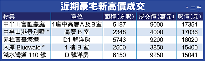 豪宅呎價屢創新高,市場料放盤業主心雄反價個案將不絕。