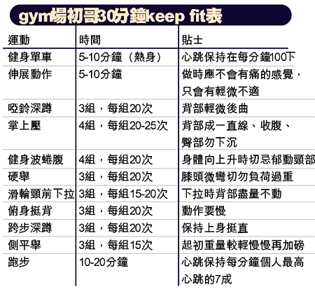 Michael:這些運動包括帶氧運動,可提升心肺功能,還有重量練習,因為適度的肌肉不但令一個人看上去健康點,還有助燃燒體內脂肪。切忌一開始就拉筋,必須先熱身才去做,如慢跑、跳繩、踩健身單車或划艇機,主要是將心跳提升到每分鐘跳一百下(平常人每分鐘約七十下)。