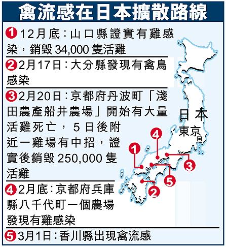 日本當局憂慮禽流感進一步蔓延之際,國內第三個證實出現疫情的地區——京都府,周一有一對養雞場東主夫婦自縊身亡。該農場上月底在區內首先爆發禽流感,東主被指隱瞞疫情,令當局未能及早防範禽流感擴散。警方相信他們是負疚自殺,其遺書稱:「很抱歉,給了大家很多麻煩。」