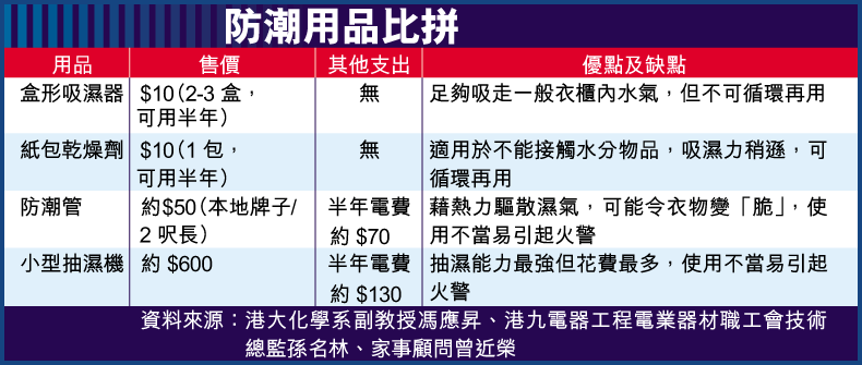 消費者委員會副總幹事劉燕卿表示,價錢便宜的防潮用品其實已足夠除去一般家居衣櫃的濕氣,其中吸濕器內的氯化鈣吸濕能力最高,但不可循環再用;硅膠吸濕能力稍遜,但適用於不能接觸水份的貴重物品如相機等,亦可再用。