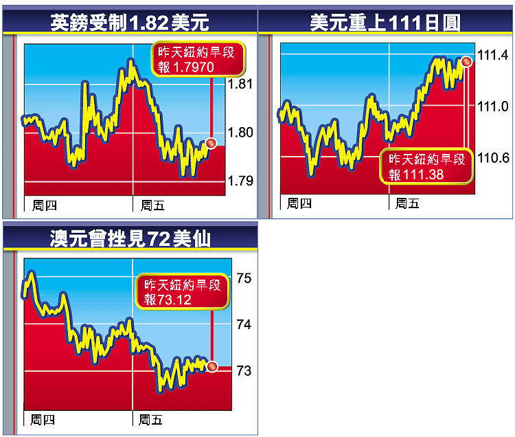 紐約早段,歐元報1.2241美元,跌1.14美仙;英鎊報1.7970美元,跌1.46美仙;澳元報73.12美仙,跌0.66美仙;美元兌日圓報111.38,升0.60日圓;美元兌瑞郎報1.2803,升1.37仙。
