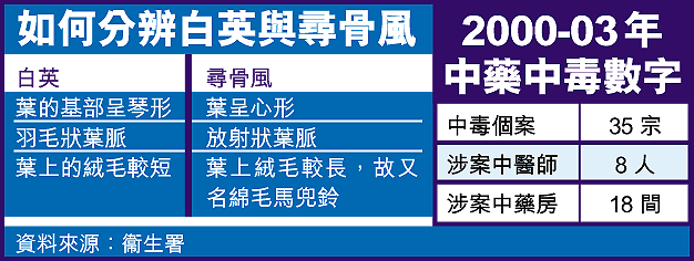 記者昨日走訪多區中藥房,當中對白英及尋骨風有認識的中醫師寥寥可數,在接受查詢的二十多間中藥房中,更只有一家有存貨。而鰂魚涌大部份中藥房,昨日已在店內擺放了衞生署的告示,有店主更拿着告示,與藥櫃的藥物核對,以免「賣錯藥」。