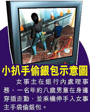 警方到場調查,並翻看銀行的閉路電視錄影帶,女事主赫然發現之前在銀行內蹦蹦跳跳的男孩,曾經在她身邊伸手進其手袋將銀包扒走,然後逃離現場。男童扒竊手法利落,警方懷疑他背後有成年人操縱,正展開追查。