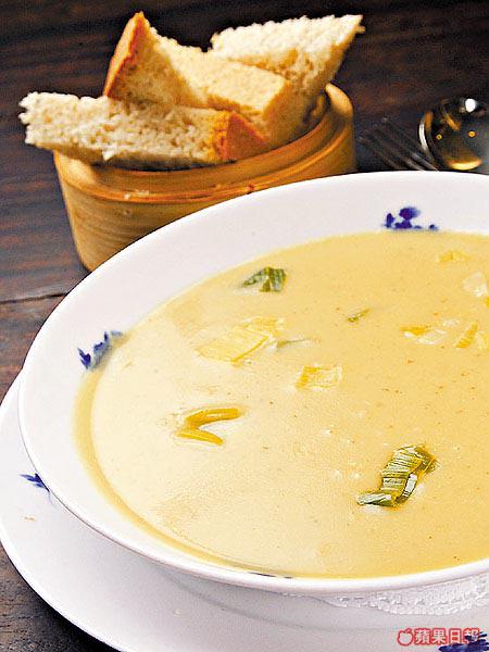 做開配角的薯仔和大葱,在英國菜裏擔正大旗,成為熱湯主角,薯茸跟切碎Leek大葱和上湯混為一鍋,熱力令薯仔的澱粉質盡展所長,故每一口都很黏很暖。