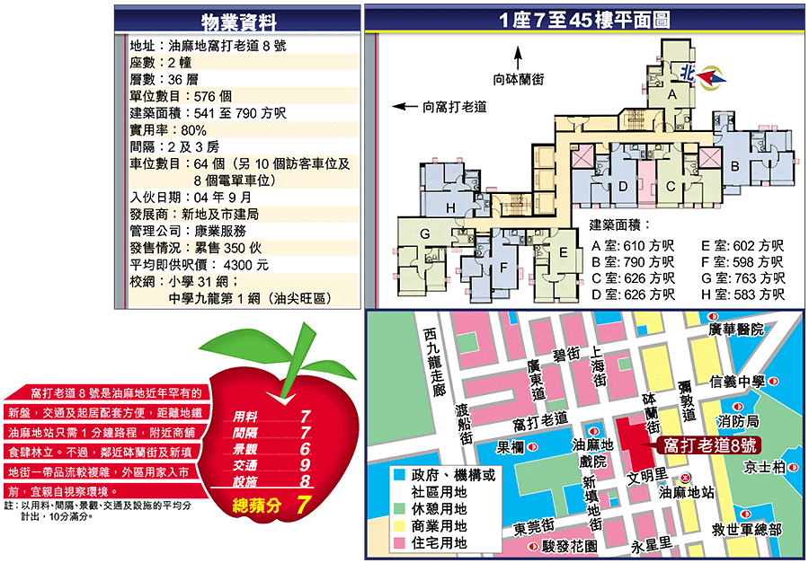 由市建局與新地合作發展的窩打老道8號,坐落於娛樂場所臨立的油麻地,物業本身也設有24小時全天候會所,即使足不出戶,也可以夜夜笙歌,完全配合該區不夜城的感覺。油麻地是舊區,因為多年沒有新盤推出,窩打老道8號配套規模雖不算大,但已遠勝同區舊樓。