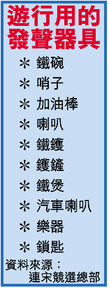 藍營兩星期前匆匆組織這次活動,想不到響應者如此眾多,令哨子、汽笛極度「渴市」,鐵哨子的售價從平時的五元台幣,一路飆升,至昨天已升至十元,甚至有錢也買不到。為響應環保,連宋競選總部早在遊行舉行前,已呼籲與會民眾將家裏的大、小國旗及會發出聲音的哨子、喇叭、鍋、鐵碗等工具自行攜帶前往遊行,向總統陳水扁發出不滿的聲音。