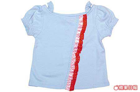 粉藍色棉質上衣,衫身有少少荷葉絲帶花邊作點綴,而膊頭的小吊帶設計亦十分精緻。