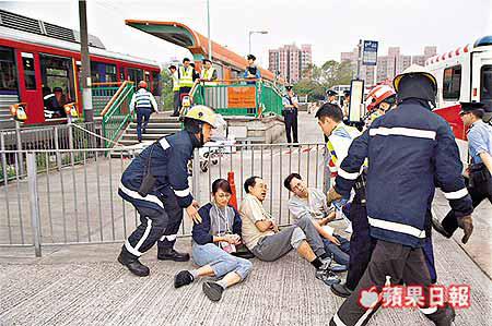 昨晨十時許,天水圍洪天路輕鐵緊急月台出現「巴士撞輕鐵」的緊張場面,數十名包括消防員、警員、救護員及民安隊等救援人員,趕到「車禍」現場救人。運輸署緊急事故協調中心投入運作,協助疏導交通,九廣東鐵逾百名職員則在各輕鐵站戒備,現場氣氛極度緊張。