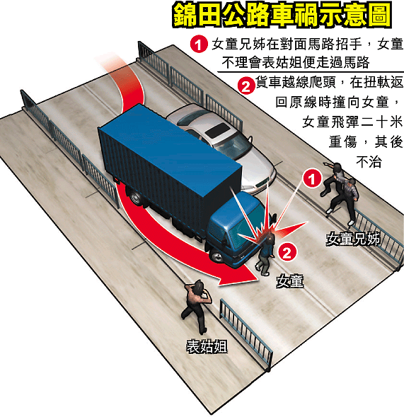 【本報訊】元朗錦田公路昨日發生嚴重車禍,一名七歲女童在橫過馬路時,被一輛懷疑越線爬頭及開着強勁音響的貨車撞倒,女童被撞至飛彈二十米倒地,頭部及四肢受重傷,經送院急救後延至晚上七時五十分傷重死亡,警方對事件正展開調查。 記者:黃學潤、周鴻熙
