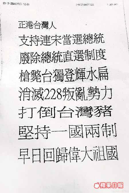 槍擊案發生後,綠營透露事前曾收到反台獨者恐嚇信,明顯想將槍擊定性為政治事件,矛頭直指選舉對手。但這種講法最令人難以信服的是,無論國親聯盟連戰,以至北京政權,根本不可能因槍擊受益。