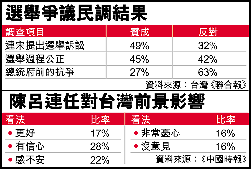 至於連宋提出選舉訴訟,支持者佔四成九,反對者只得三成二。其中,連宋支持者有八成二力挺連宋提出選舉訴訟,只有一成一不支持。這項民調結果顯示,雖然較多的民眾支持藍營提出選舉訴訟,但藍營持續三天的抗爭似未得到廣泛認同。這將對藍營如何引導這場抗爭、如何結束這場抗爭構成壓力,一旦民意支持度持續低迷,將對藍營角逐立委造成障礙。