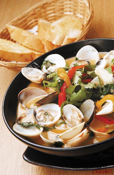 來自馬來西亞的大蜆,肉質肥美,海水味重,而且一星期只來貨二至三次,所以時常供不應求;大蜆用迷迭香等多種香草煮過,而且配以乾葱及芫荽的濃郁口感,更能突出大蜆的鮮甜味道。