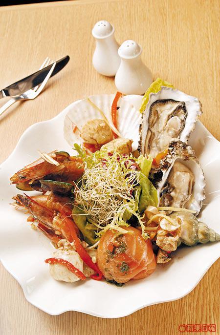 這款份量十足的海鮮拼盤,內有中蝦、魷魚、帶子、煙三文魚、蜆肉、生蠔、青口及螺肉,以燒烤為主,伴以田園沙律和特色香醋汁同食,味覺清新略帶酸甜,是頭盤開胃菜的先驅。