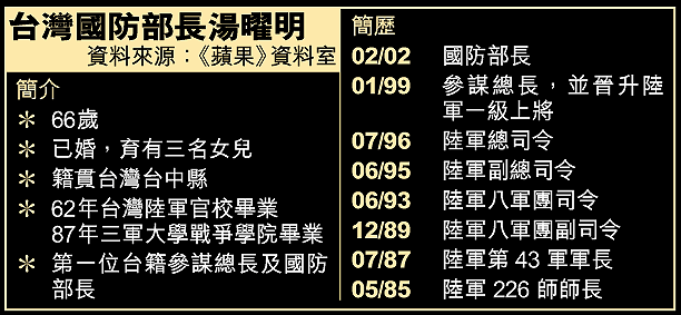 六十六歲的湯曜明,是統領台灣三十萬大軍的最高指揮官。他原定昨日上午到立法院接受質詢,但臨時以生病住院為由,改派副部長林中斌等出席。藍營立委爭先就當局啟動國安機制,影響二十萬軍人、警察和憲兵投票提出質疑,親民黨立委秦慧珠甚至指摘,湯曜明患的是「政治病」。