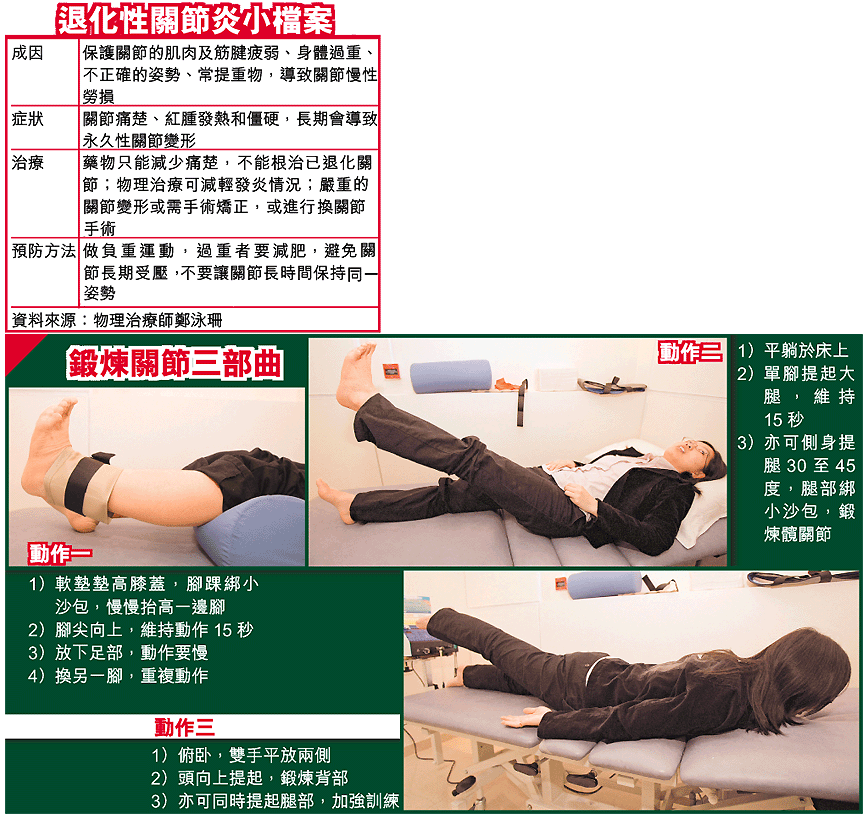 她強調,服用類固醇是令關節退化的主因,故哮喘患者要特別留意,一般人要注意搬重物的姿勢,關節受傷後應盡早尋找適當治療,「食止痛消炎藥只係治標,物理治療嘅針灸同超聲波都有消炎作用,但最好都係及早預防。」