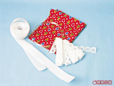花布半碼$15、魔術貼1碼$8、花邊1碼$5、膠圈1個$10、吸濕珠1包$10
